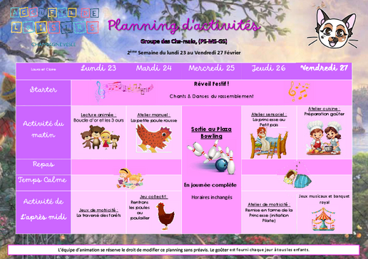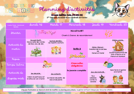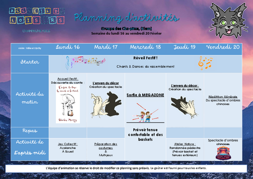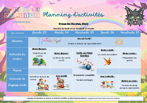Un planning d’activités élaboré par notre équipe sera proposé à votre enfant. Il n’est pas figé.
