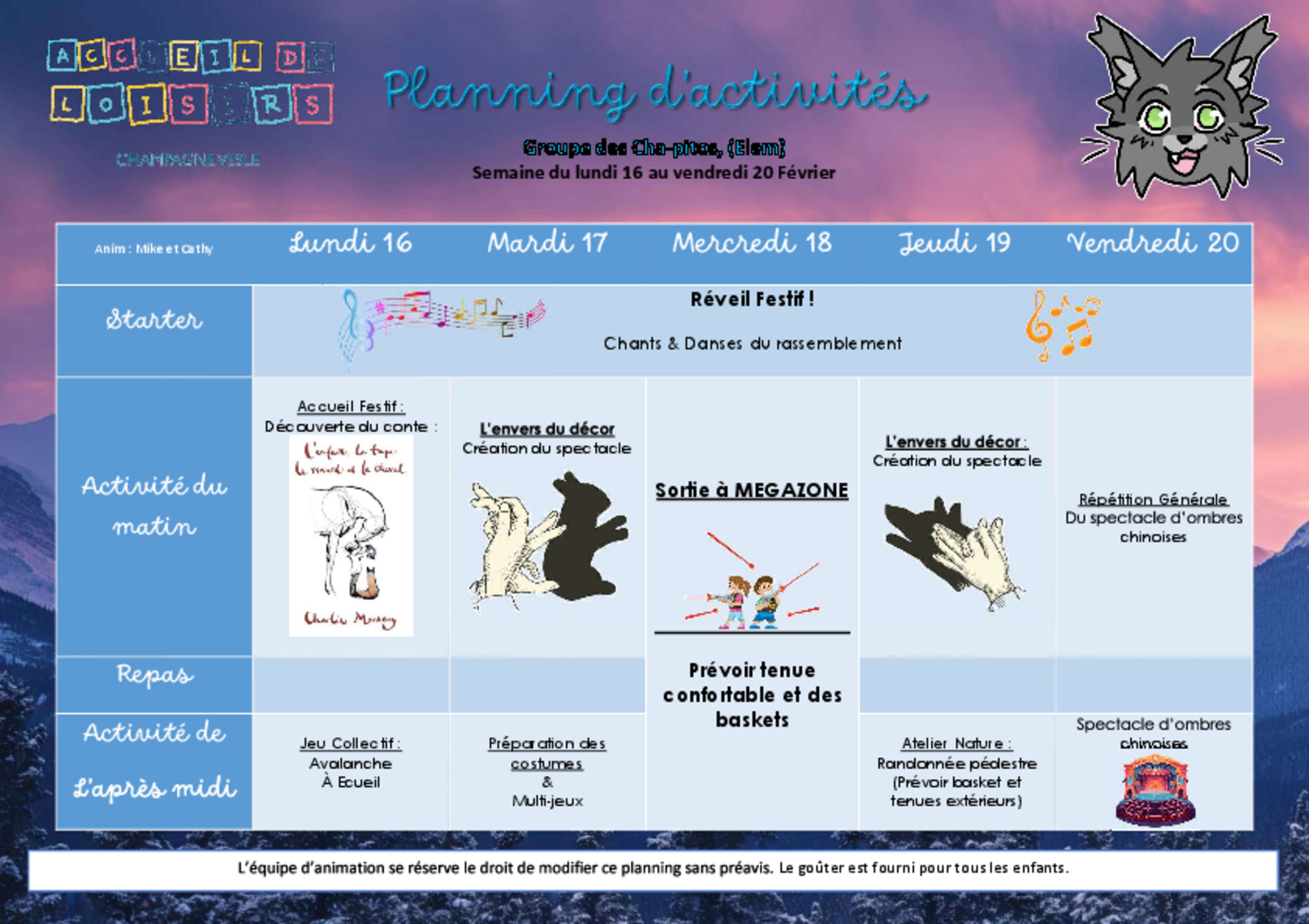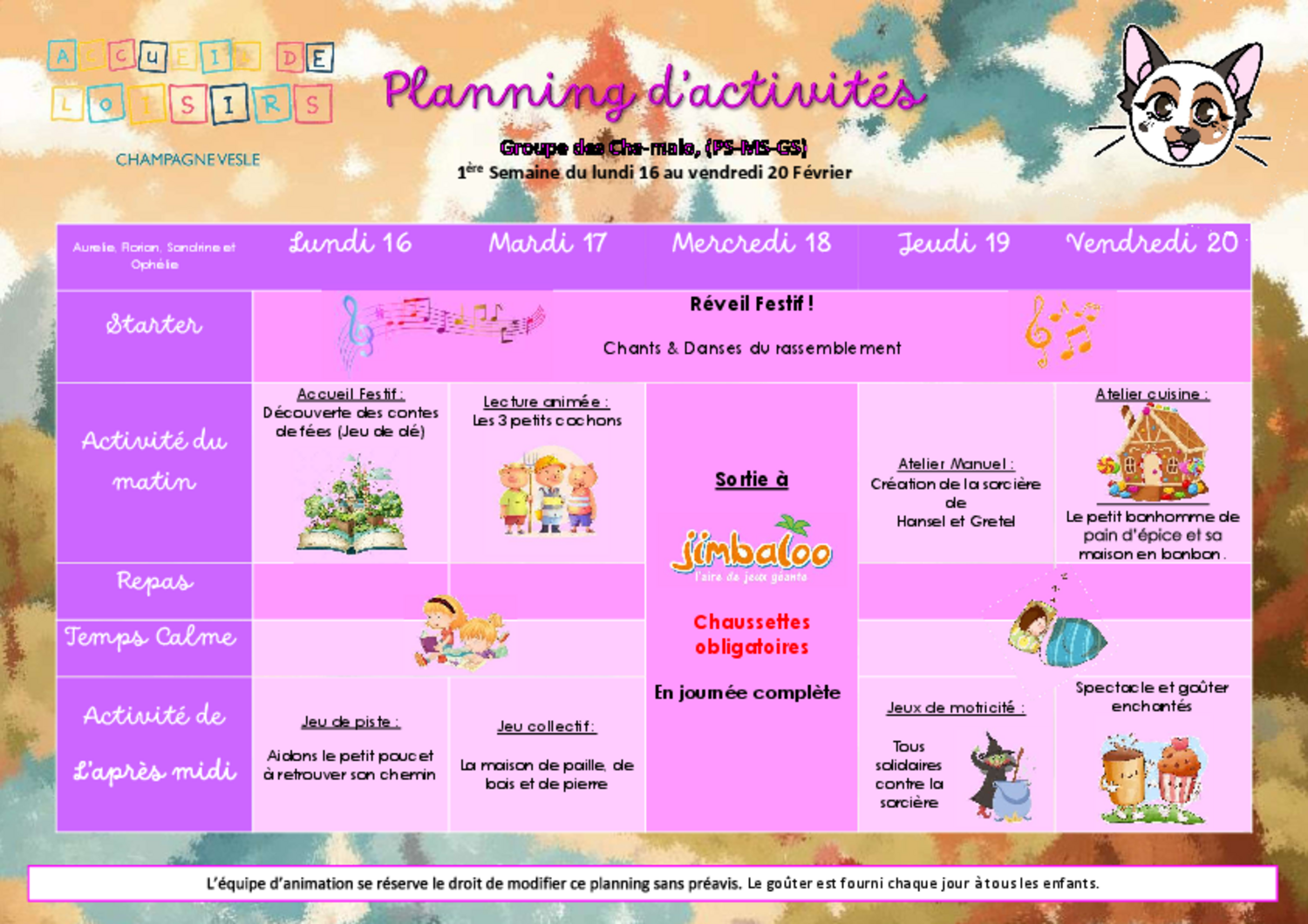 Des activités sportives, culinaires et manuelles seront également mises en place. Les groupes d’âge peuvent être réajustés et adaptés en fonction des effectifs réels et au rythme de chacun.